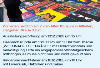 Zur Eröffnung am 13. Dezember um 15 Uhr sind alle Interessierten herzlich eingeladen, die Ergebnisse vor Ort im ehemaligen Konsum Altkalen zu entdecken.