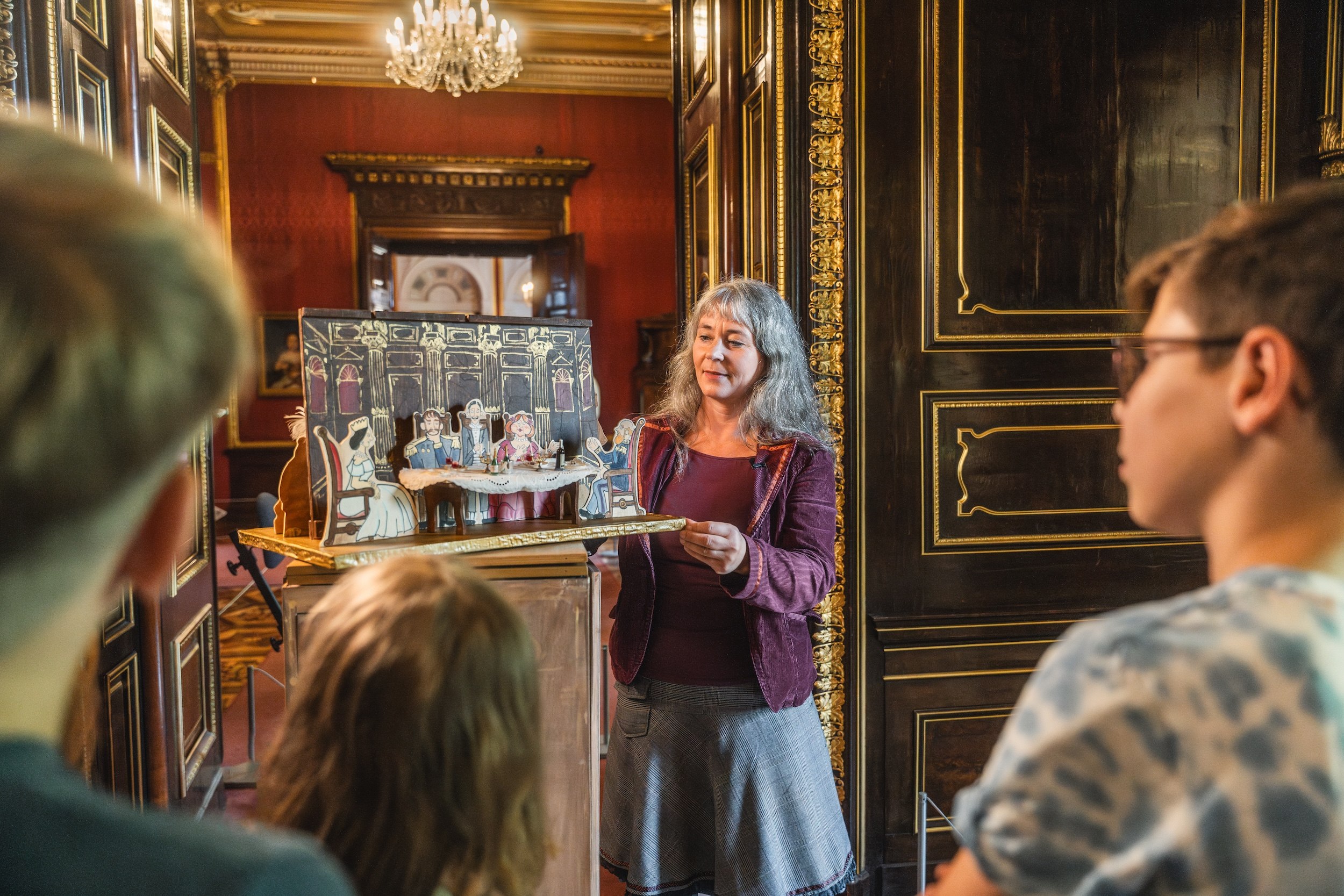 Eine Familie schaut bei einer interaktiven Puppenspielführung zu, die durch das Schloss Schwerin geht.