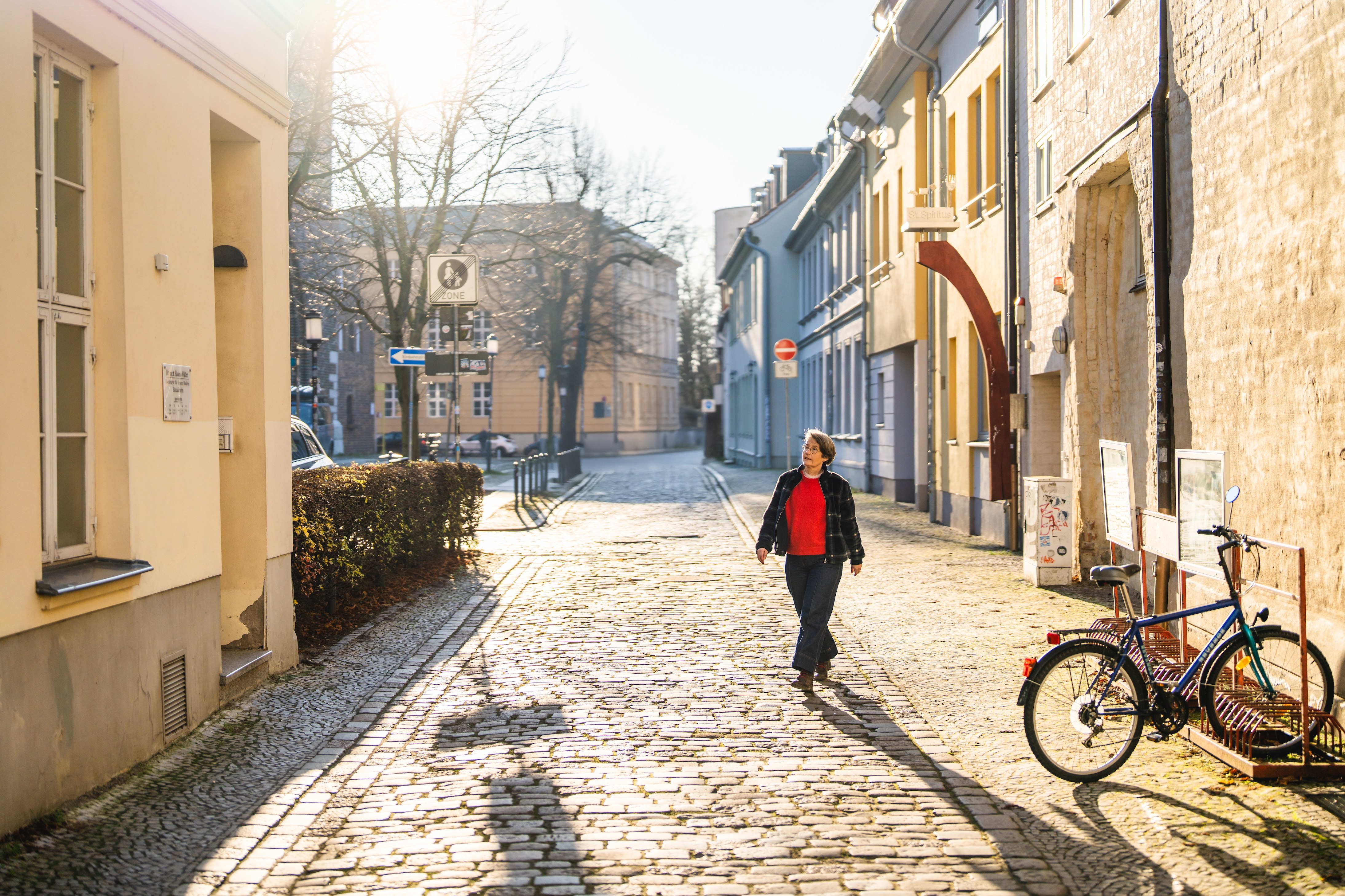 Die untergehende Wintersonne lässt den knallroten Pullover von Birte Frenssen leuchten. Die Frau mit dem zeitlosen Kurzhaarschnitt und den wachen, braunen Augen steht auf einer Brücke über dem Ryck, ihr Blick ist auf das Wasser gerichtet. „Na, hat geklappt?“, fragt plötzlich eine ältere Dame im Vorbeigehen. Frenssen dreht sich um, lächelt und atmet tief aus. „Ja, hat alles geklappt.“