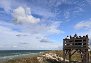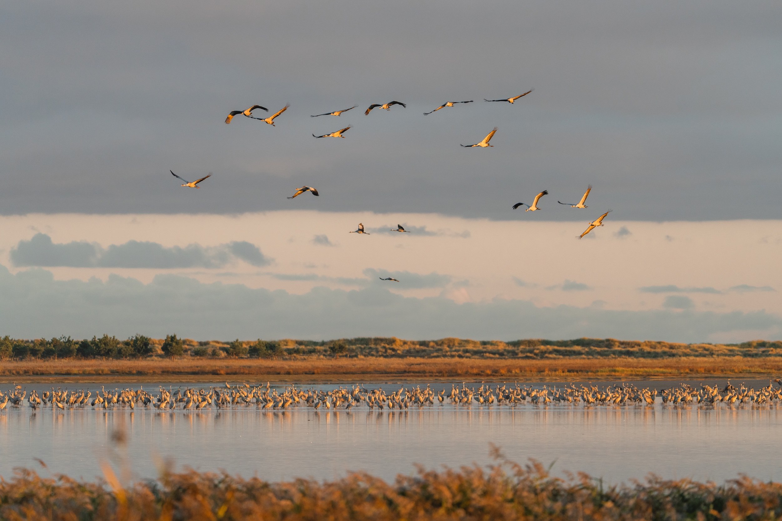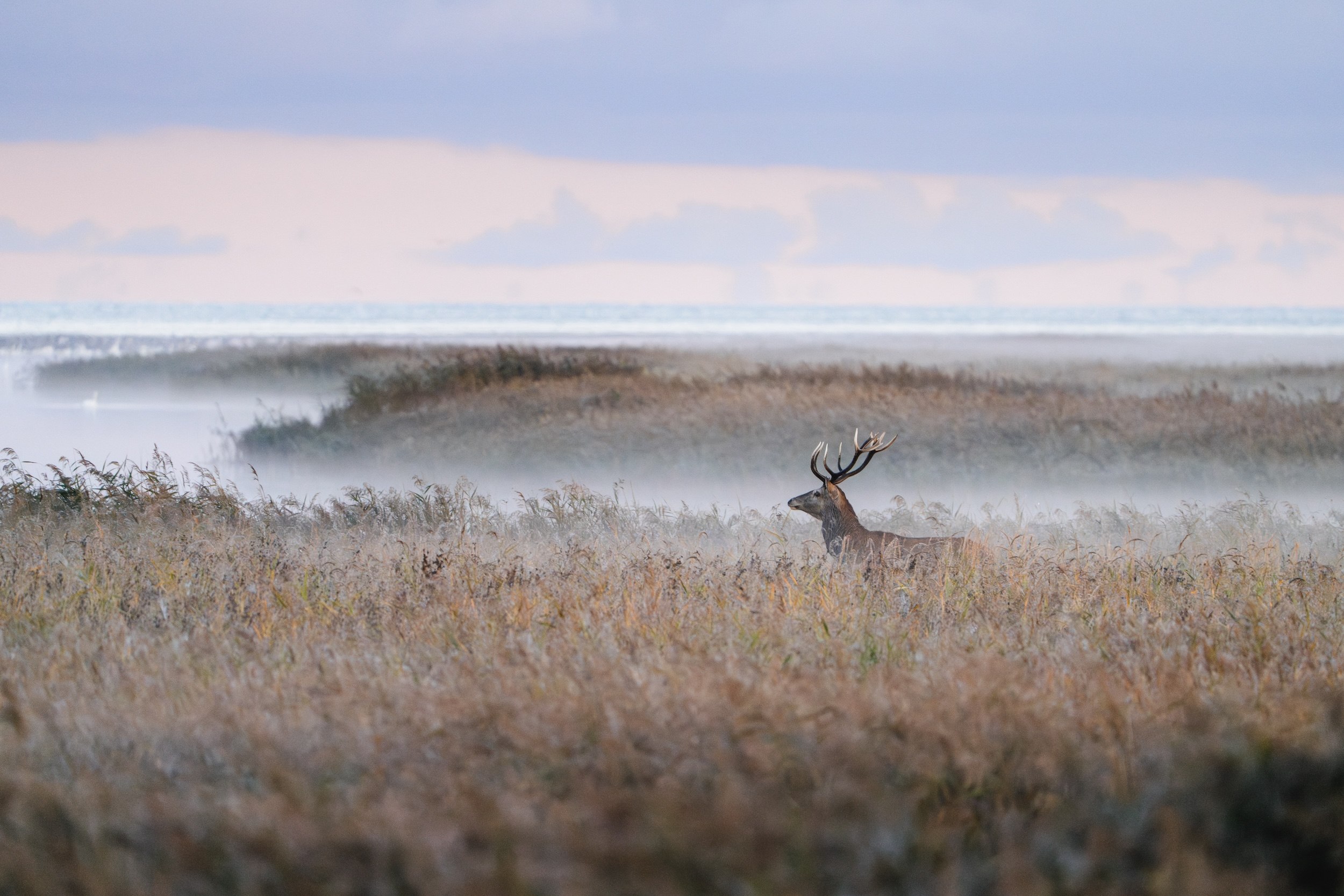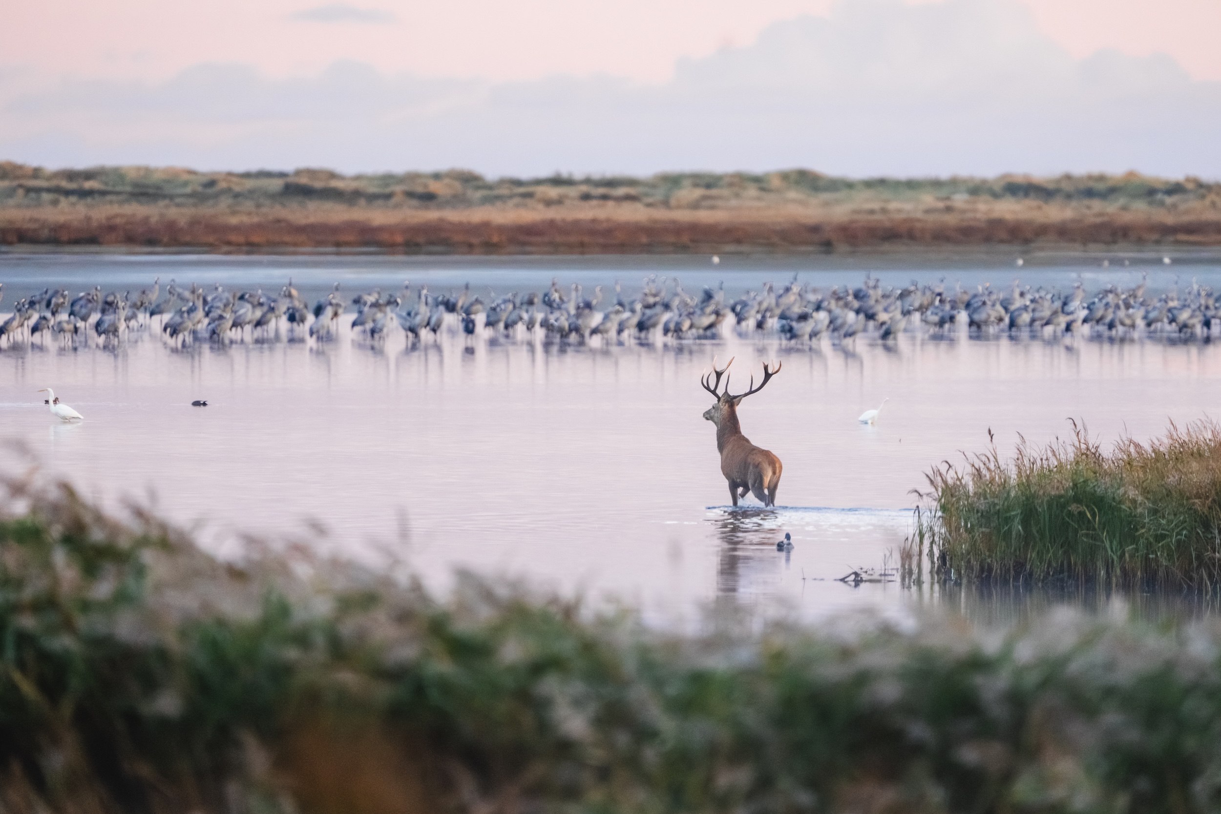 Mit der Morgendämmerung kommt Leben in die Vogelschar. Pünktlich mit der aufgehenden Sonne brechen die Kraniche lautstark auf, um Futter zu finden und Energie für die bevorstehende Reise zu sammeln. Immer wieder übertönen lautes Gurren und Trompeten das Rauschen des Windes. Marios Augen leuchten voller Vorfreude: »Da draußen sind bestimmt 10.000 Vögel«, sagt er und bringt sein Stativ in Stellung. Noch ist die Sonne nicht zu sehen, doch langsam dämmert es. Nebelschwaden wabern über das Strandgras und die grau-blaue Nacht weicht einem seichten, blass-gelben Licht. Je heller es wird, desto lebendiger werden Vögel. Die Anspannung vor dem Aufbruch ist spürbar. »Das ist der beste Zeitpunkt für tolle Naturaufnahmen«, flüstert Mario den Teilnehmern seines Fotoworkshops zu. »Die Vögel brechen gleich auf und dazu hat man das Licht des Sonnenaufgangs. Wenn wir richtig Glück haben, läuft vielleicht sogar ein Hirsch durch die Lagune, während oben die Kraniche fliegen.« Und tatsächlich: In den silbrigen Nebelschwaden, zeichnen sich die dunklen Silhouetten von mehreren Hirschen ab. Mit jeder Minute, die es heller wird, sind sie besser zu sehen. Es sind majestätische Tiere.