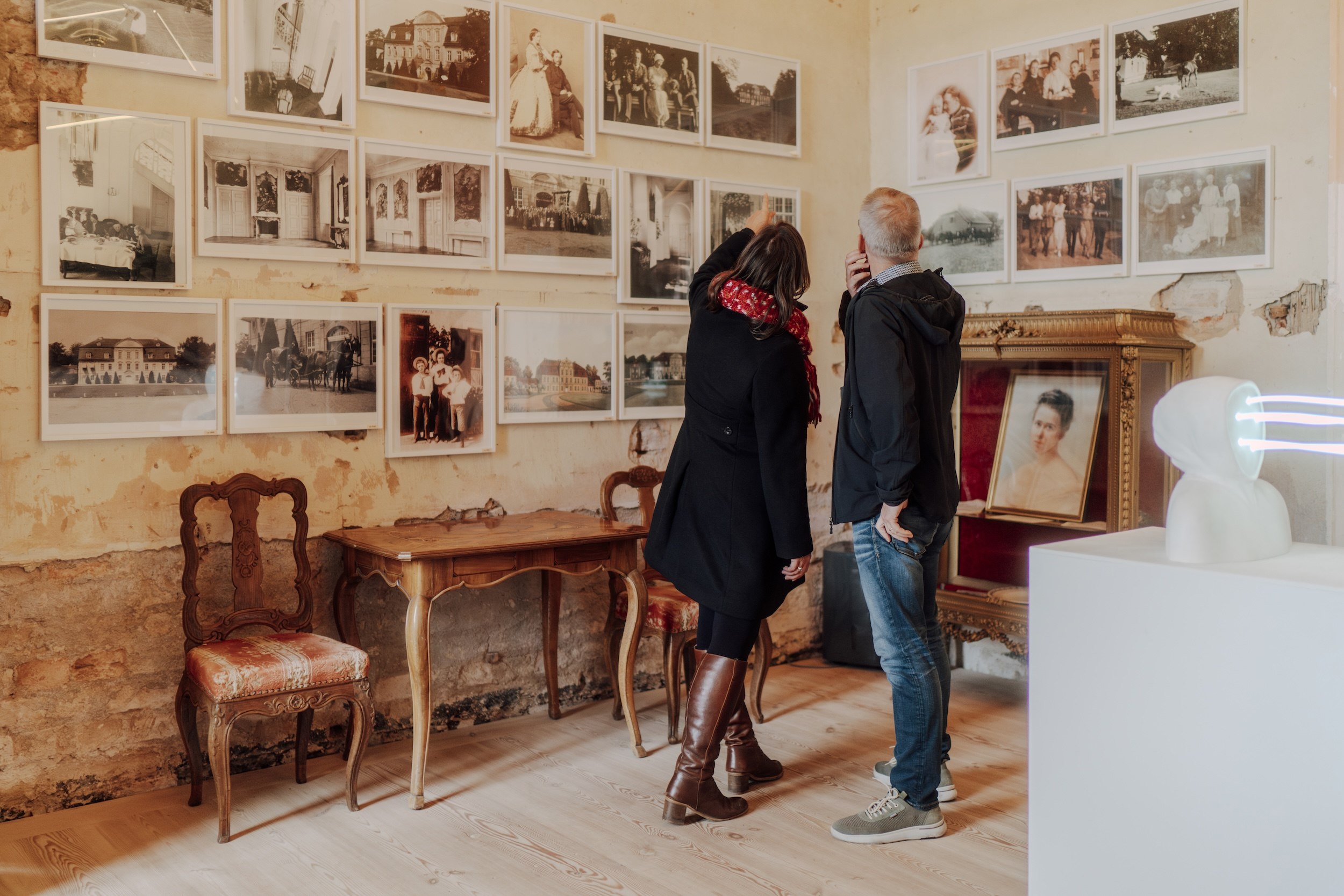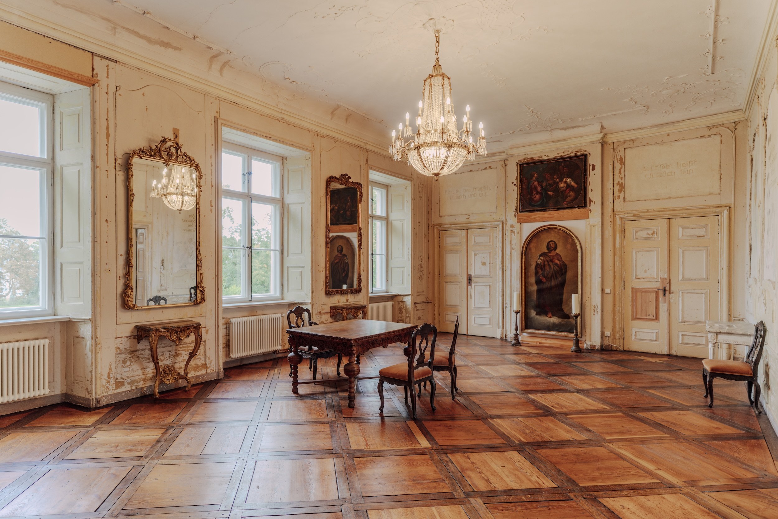 Jannis führt seine Gäste durchs Haus, beantwortet Fragen und erweist sich nicht nur als Geschichts-, sondern auch als Kunstkenner. In einem der beiden Gesellschaftsräume, dem Barocksaal, weist er sichtlich stolz auf die bemalte Holzdecke hin: „Hier handelt es sich um eine echte Sensation“, erklärt er. „Unter prächtigen Stuckdecken und Zeitungen aus dem 19. Jahrhundert fanden wir bei der Sanierung diese alten Malereien. Sie zeigen Szenen aus Ovids Metamorphosen, hier ganz konkret den Jäger Actaeon. Als unfreiwilliger Voyeur beobachtet er die nackt badende Göttin Diana und wird zur Strafe in einen Hirsch verwandelt und von seinen Hunden zerfleischt.“