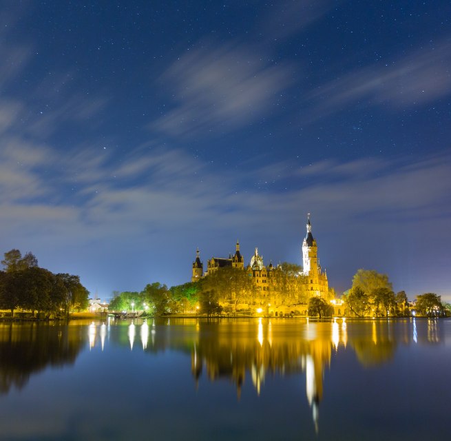 Het kasteel drijft op een klein eiland in het grote meer van Schwerin. Sprookjesachtig, sierlijk en delicaat tegelijk, rijst het trots en vol waardigheid op uit het op drie na grootste meer van Duitsland. De indrukwekkende voorouderlijke galerij, koninklijke pracht en praal en de oranjerie mag je niet missen. Het deelstaatparlement van Mecklenburg-Vorpommern is nu gevestigd op de plek waar ooit de harten regeerden.