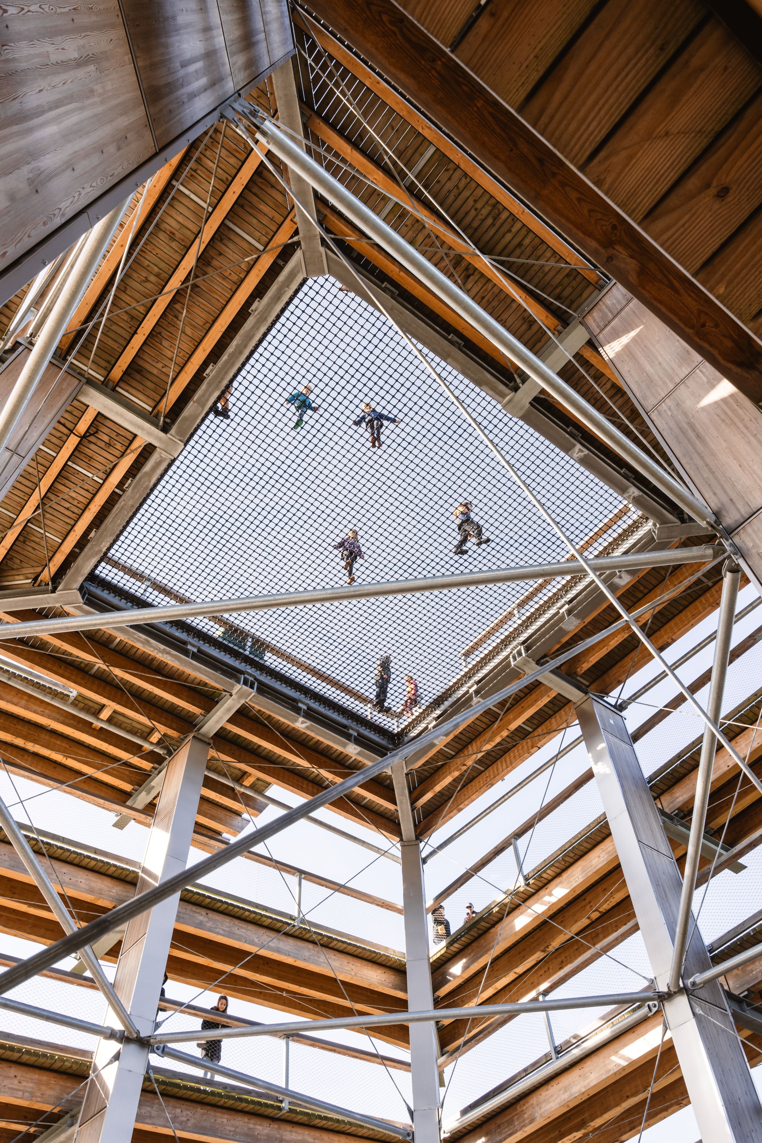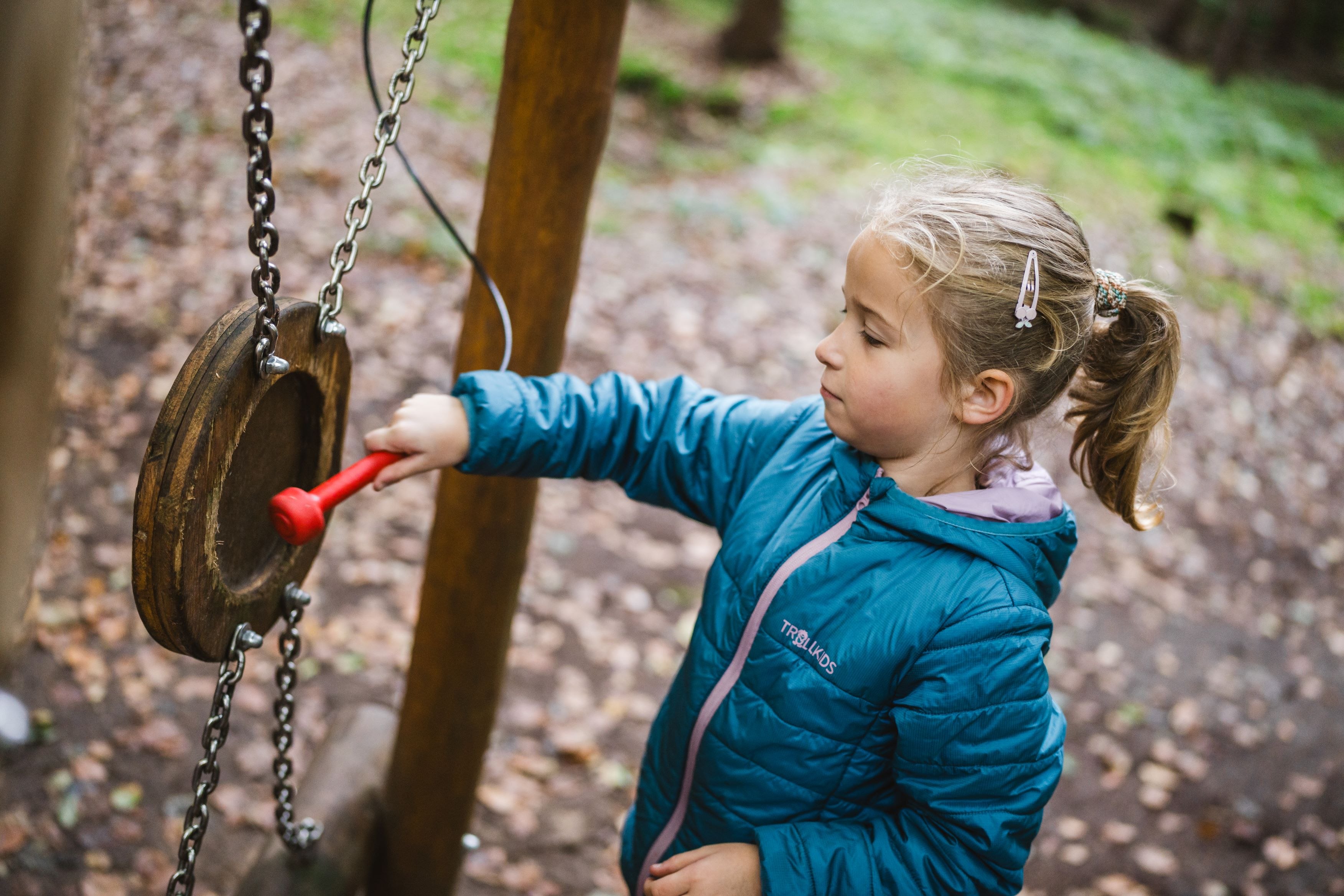 Maar de drie meisjes willen niets horen over ontspanning. Ze ravotten door het bos, rennen van station naar station. Van het schommelnest naar de fluistertelefoon, dan door naar de dappere trappenkoning, waar ze een hindernisparcours afleggen, en vandaar naar de klankboom. Sofia neemt voorzichtig de hamer in haar hand en slaat er zachtjes mee tegen de geluidsbalken voor haar. Heldere klanken galmen door het bos en smelten samen tot een vrolijke melodie. Carlotta wordt wilder, ze slaat hard op de stokken en het bos wordt even een feestelijke mijl.