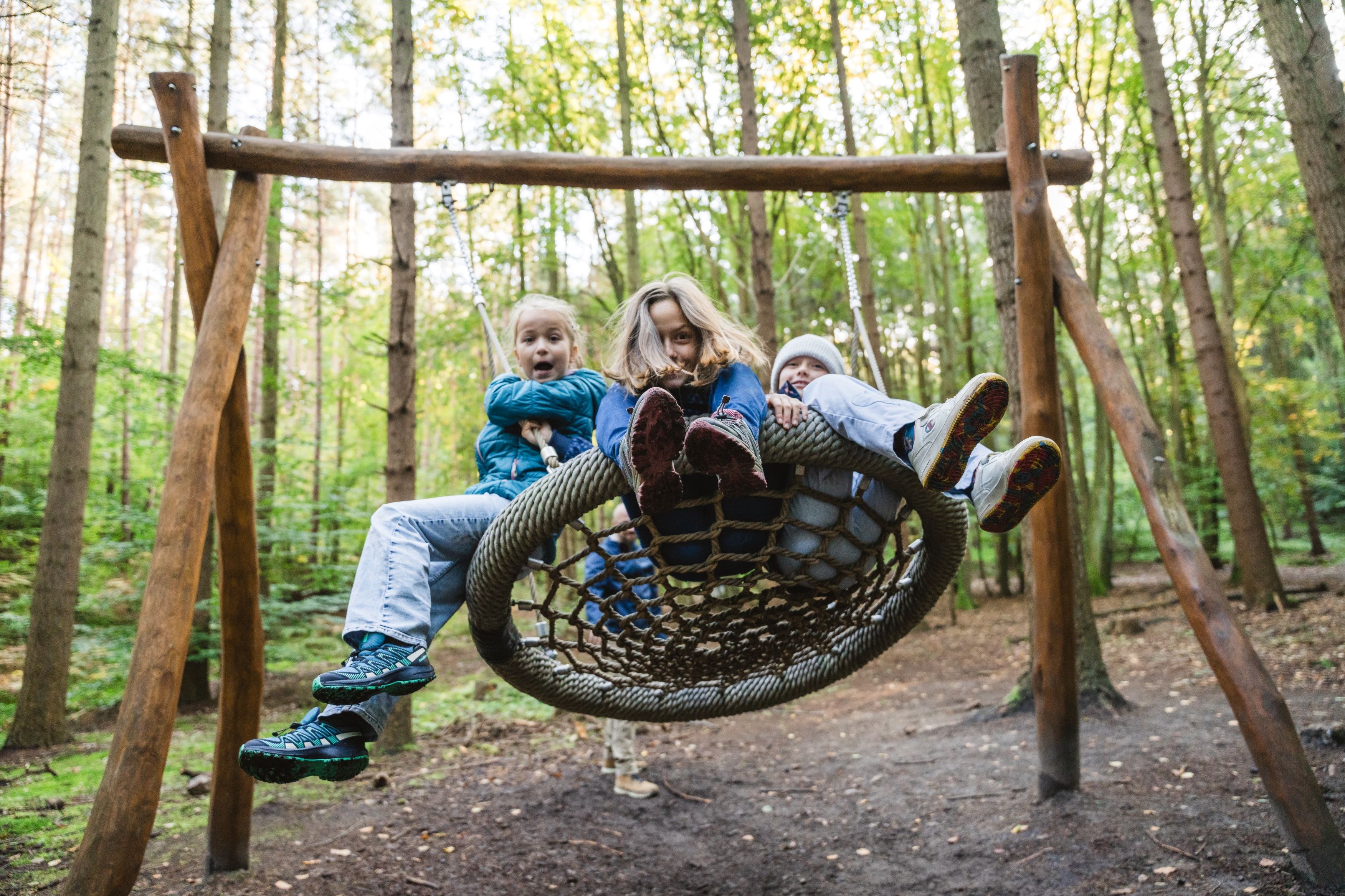 Het eerste station dat Sofia, Ricarda en Carlotta hebben gekozen is het schommelnest onder de bomen. Ze klimmen met z'n drieën in de ronde structuur, gaan op de rug liggen en laten zich door Ricarda's vader duwen tot Carlotta het uitschreeuwt: »Zo is het genoeg, zo is het genoeg! « Iedereen lacht hardop. Dat alleen al is goed voor hun gezondheid. Maar schommelen wordt ook verondersteld het evenwichtsgevoel en de motoriek te trainen. Ontspannen schommelen werkt ook kalmerend.