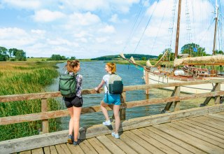 Hier bij de Lebbiner Brücke op het schiereiland Liddow hebben de twee studenten al twee kilometer van de Bodden Panorama Trail afgelegd vanaf het startpunt in de gemeente Neuenkirchen. Dit betekent dat ze het grootste deel van de door de Duitse wandelbond bekroonde kwaliteitswandelroute nog voor de boeg hebben. De route loopt in totaal 24 kilometer door weilanden, bossen, dorpen en velden langs de Grote Jasmund Bodden. De bestemming: het Oostzeestrand in Mukran. De route kan als sportieve dagtocht worden gelopen of in tweedaagse etappes met een overnachting in Ralswiek halverwege. Maar voor Jess en Laura is het duidelijk dat ze in één dag de Oostzee willen bereiken. Dus daar gaan ze! Daar gaan we.