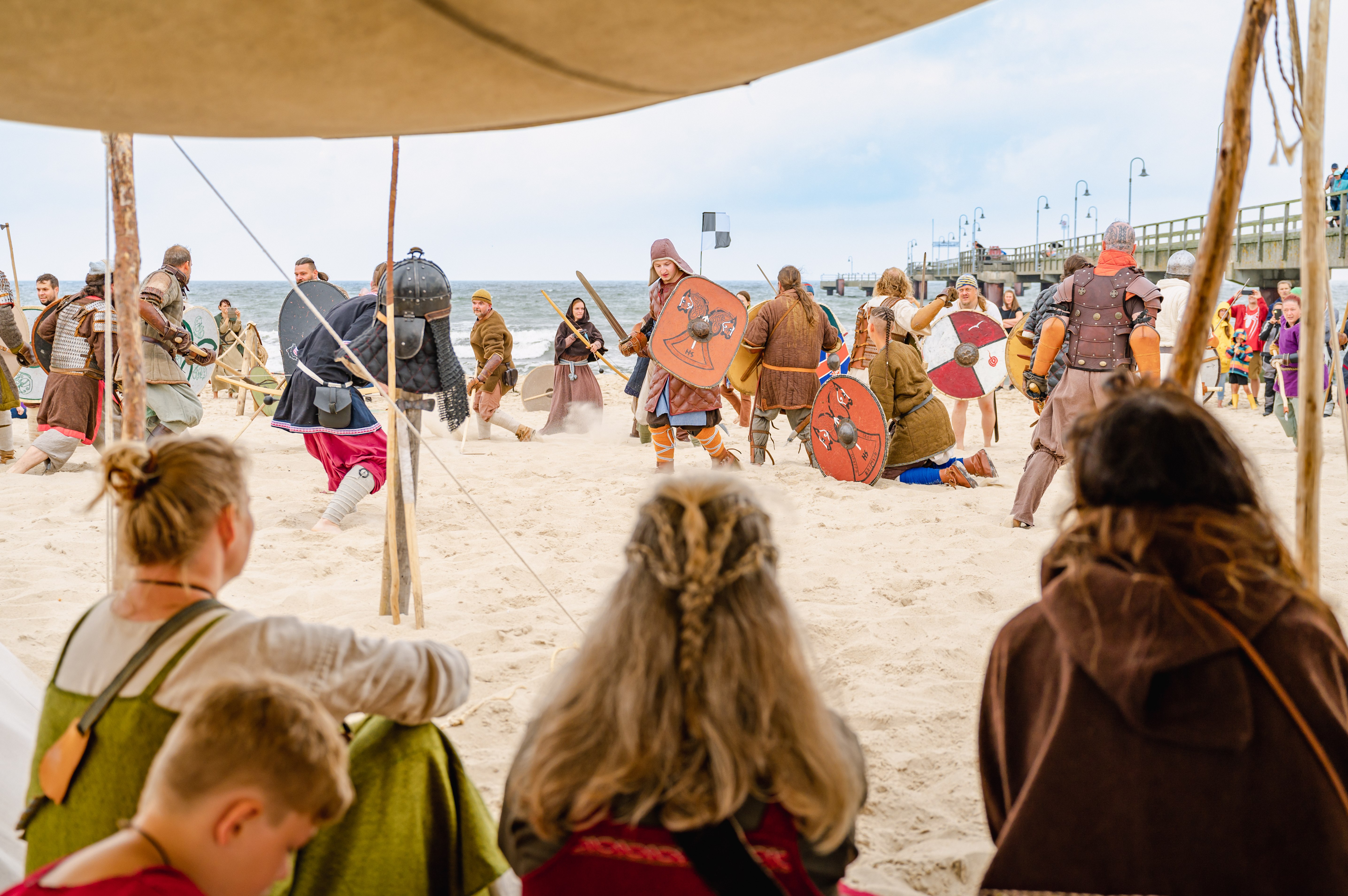 De menigte toeschouwers, die zich in groten getale rond de ongeveer 50 vechtende mannen op het strand van Gießen heeft verzameld, kan deze humoristische woordenwisseling gemakkelijk aanhoren en hardop lachen. Deze Vikingen hier, die elkaar net te lijf zijn gegaan met luid gebrul, zwaarden, speren, bogen en pijlen, lijken de vechtmoraal niet erg serieus te nemen. Per slot van rekening is dit weekend in augustus 2022 in Göhren in de eerste plaats gewoon een hoop lol, wat nu voor de vijfde keer plaatsvindt.