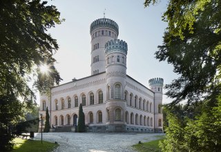 Wie ein Wahrzeichen krönt das Jagdschloss Granitz den Tempelberg inmitten des 1.000 Hektar großen Waldgebiets auf der Ostseeinsel Rügen. Wo 1726 bereits ein kleines Jagdhaus der Fürsten zu Putbus stand, ließ sich Wilhelm Malte I. zwischen 1837 und 1846 ein großes Jagdschloss errichten. Die fünf zinnenbekrönten Türme verleihen dem Gebäude den Charakter einer mittelalterlichen Burg. Sein Markenzeichen – den 38 Meter hohen Mittelturm – erhielt das Schloss aber erst durch den preußischen Staats-und Stararchitekten Karl Friedrich Schinkel, der eine Idee des preußischen Kronprinzen Wilhelm umsetzte.