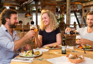 Lebendig ging es in der Diele zu: Säcke und Fässer wurden angeliegfert. Das bis heute original erhaltene Lastenrad aus Holz verteilte sie per Seilaufzug auf die Speicherböden. Sämtlichen Platz brauchte man für Waren. Gewohnt wurde deshalb im Kemladen, dem Anbau auf dem Hof. Wer den Kopf einzieht, kann im Keller den Hausbaum suchen und im Obergeschoss das Hübsche an der "Hübschen Stube" finden. Was wurde wohl in der Schwarzküche gekocht und woher stammen die kunstvollen Tapeten? Für die jüngsten Gäste gibt es Ausmalvorlagen mit den Tapetenmustern an der Kasse.
