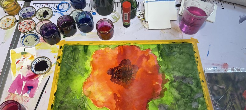 Buntes Steinzeug Geschirr, geritzt und mit Engoben bemalt, bei 1140° C im Elektroofen gebrannt.