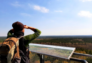 Der Aussichtsturm bietet einen Panoramablick über eine Moorlandschaft aus zwei verlandeten Seen. Mit ein wenig Glück kann man neben See- und Fischadlern auch Kraniche im Schilf entdecken.