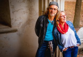 Eva Güthoff modelliert hier ihre Skulpturen, Akte und Portraits aus grobem Steinmetzton. Ihr Mann zeigt Naturfotos.