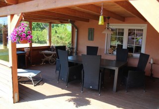 Ein Wohnzimmer mit offener komfortabler Küche, 2 Schlafzimmer mit jeweils einem Doppelbett befinden sich in der unteren Etage des Hauses. Ein weiteres kleines Schlafzimmer mit einem Einzelbett ist im Obergeschoss und über eine Wendeltreppe erreichbar. Ein Badezimmer mit Dusche/WC und einer Badewanne steht Ihnen zur Verfügung. Das Haus bietet 6 Personen Platz. Auf der überdachten teilverglasten Terrasse können Sie sich nach einem erlebnisreichen Urlaubstag entspannen. Zum Haus gehören 2 Pferde 2 Katzen.