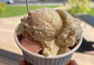 Eis aus eigener Herstellung - Eisbecher & Kaffee, gemütlich genießen auf der überdachten Außenterrasse