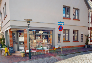 Café mit Innenhof, Kaffeespezialitäten, Frühstücksvariationen, hausgebackene Kuchen und Gebäck