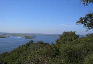 Feldsteinkirche aus dem 13. Jahrhundert auf einer Anhöhe mit Blick über den Peene-Strom zur Insel Usedom.