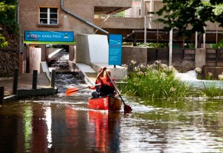 Der Fisch-Kanu-Pass (Kanu-Rutsche) ist eine abenteuerliche Attraktion in Fürstenberg/Havel. Kanuten und Fische können so ungehindert auf einem Havelarm vom Röblin- in den Schwedtsee und in umgekehrte Richtung wandern.