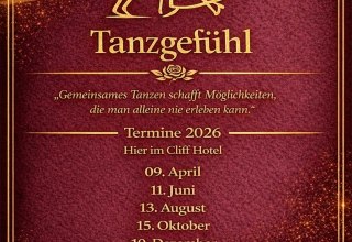 Ab März 2026 beginnt die Veranstaltungsreihe "Tanzgefühl" allmonatlich jeden 2. Donnerstag abwechselnd im Rügen Hotel Sassnitz oder Cliff Hotel Rügen Sellin. Paartanz für alle tanzwilligen und tanzinteressierten Einheimische und Gäste.