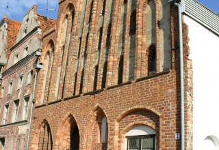 Gotisches Giebelhaus aus dem 14. Jahrhundert, mit erhaltenem Hausbaum und originalem Aufzugsrad im Dachgeschoss.