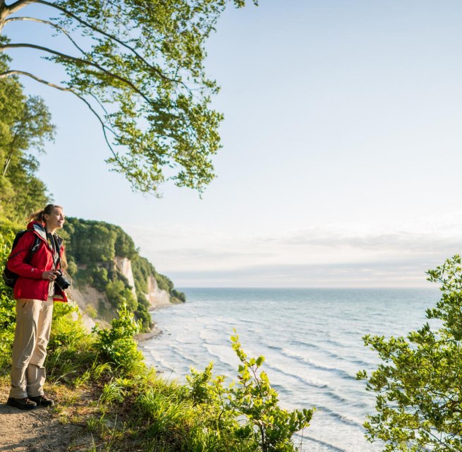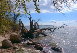 Alte Buchen säumen das Ufer des Boddens und bilden den Eingang zum „Pfad der Muße und Erkenntnis“. Dieser gut 4 km lange Pfad lässt Sie an 19 Stationen tief in den Wald eintauchen und gewährt Ihnen auf dem ersten Abschnitt einmalige Ausblicke auf Rügens Bodden und die Insel Vilm. Hier wo die Wellen mit voller Kraft wirken können, mutet die Küste wild an. Die Landschaft kann sich so natürlich entwickeln, wie die Naturgewalten es erlauben. Abgebrochene Äste und ins Meer gestürzte Bäume verbleiben am Ort. So wie an der Station der Wasser-Eichen. Sie sind ein besonderer Kraftort, der für den nächsten Abschnitt der Wanderung stärkt.