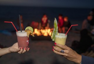 Strandparty mit Lagerfeuer, Musik und Cocktails: Ab 16 Uhr entspannt starten und bis 1 Uhr gemeinsam am Meer feiern.
